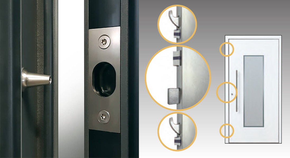 Das Türschloss verriegelt automatisch, einfach durch Zuziehen der Tür. Die verwendete 3-Fallen-Technik sorgt dabei für perfektes Schließverhalten und verteilt den Anpressdruck über die gesamte Flügelhöhe. Die Verriegelung über massive Schwenkhaken und den mit ausschließenden Hauptriegel garantieren zuverlässige Sicherheit. Geöffnet wird von außen mit dem Schlüssel, von innen über Drückerbetätigung (bei nicht aktivierter Drückersperre). Optional ist die Ausführung ohne Drückersperre erhältlich.