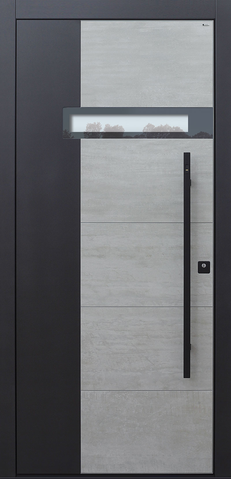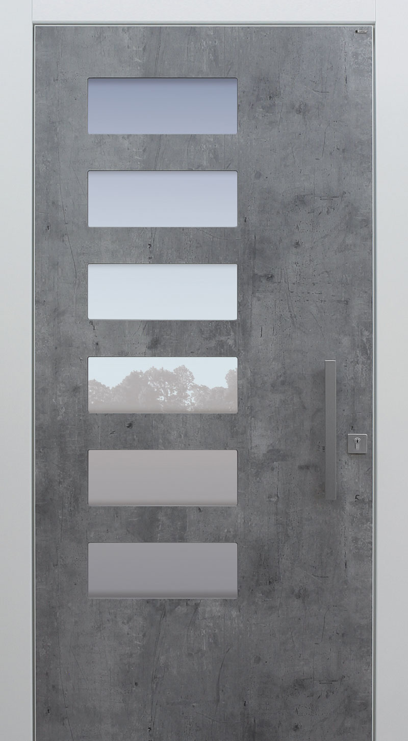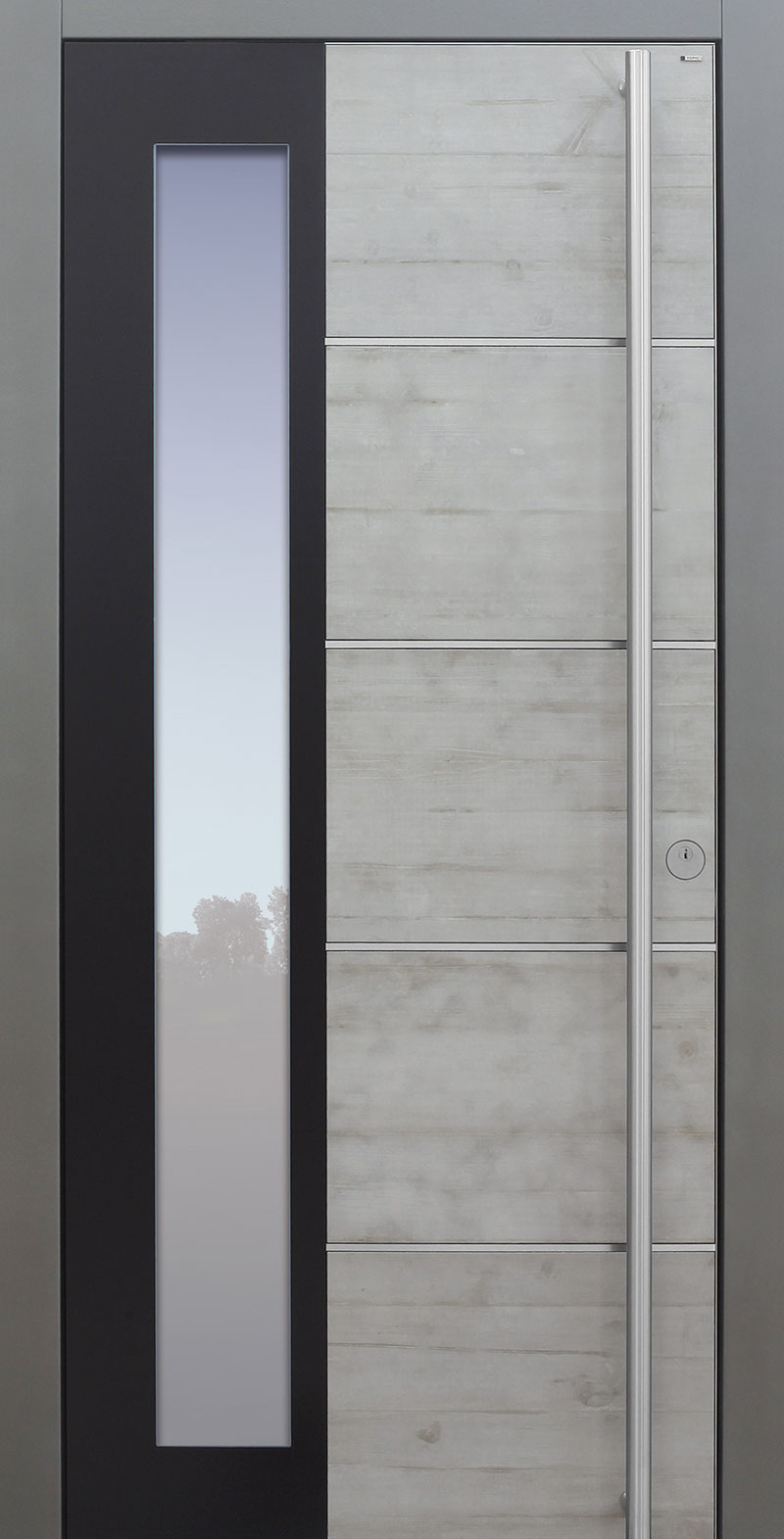 Faserverstärkte Betonplatten garantieren eine absolut wartungsfreie und extrem widerstandsfähige Oberfläche. Jede Betonoberfläche ist ein Unikat und wird in eigens angefertigten, nur einmal verwendeten, Formen abgegossen – daher gleicht kein Modell dem anderen! Dabei auftretende Farbunterschiede oder Strukturabweichungen geben der Tür ihren besonderen Charakter.
