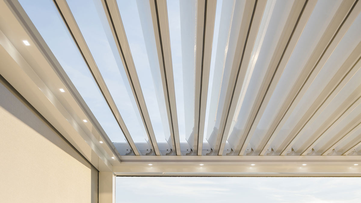 Die Standard-Ausführung unseres Lamellendachs enthält eine integrierte Beleuchtung für eine besonders angenehme Lichtstimmung am Abend, sowie eine integrierte Regenrinne. Durch die verschiedenen möglichen Formen, Größen und Variationen erhalten Sie eine größtmögliche Planungsfreiheit.