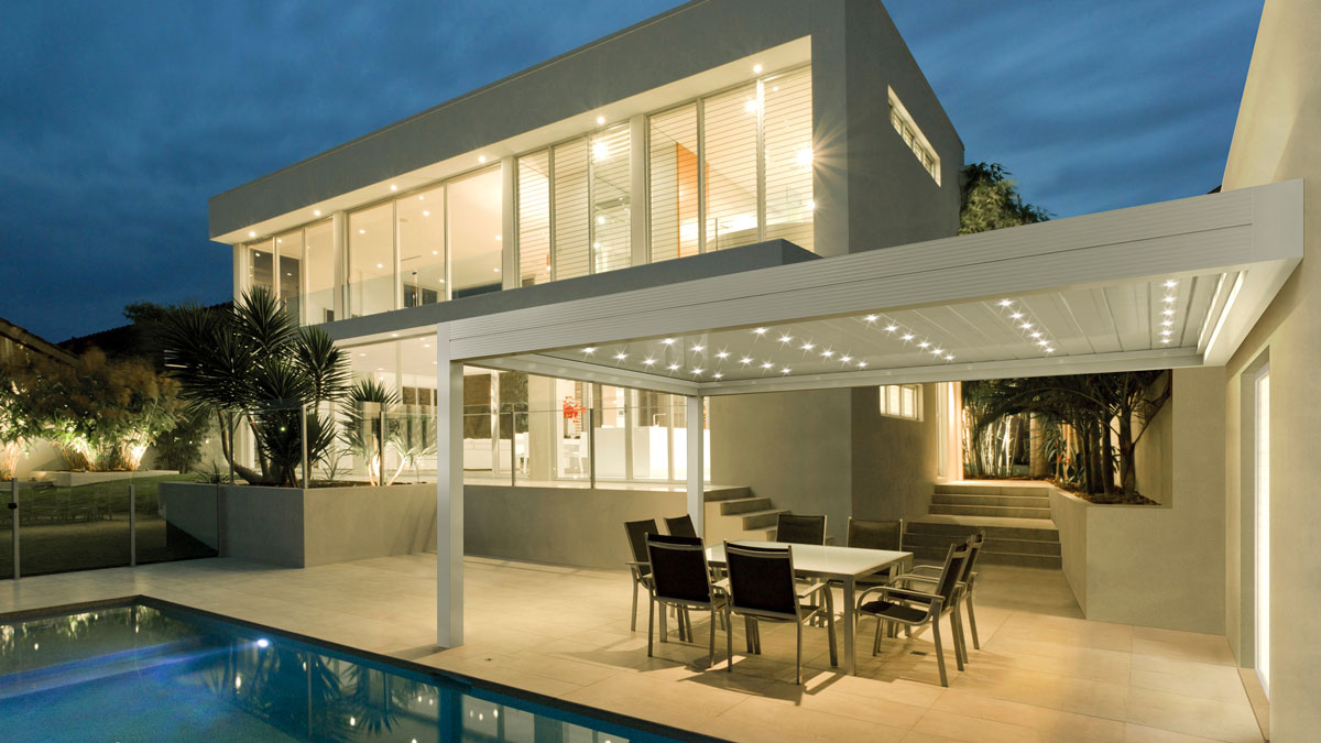 Dank der motorisierten Mechanismen und des Zubehörs kann die bioklimatische Pergola das ganze Jahr über und bei jedem Wetter zu einem perfekten Aufenthaltsort werden.